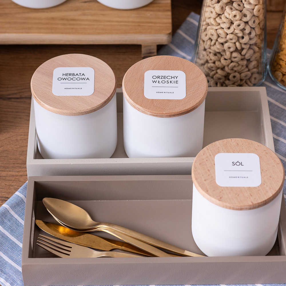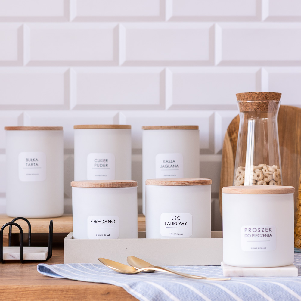 Aby ułatwić organizację, kolekcję PURE można uzupełnić o eleganckie naklejki, które pozwalają szybko odnaleźć odpowiednie składniki i i dobrze zorganizować domową spiżarnię.
