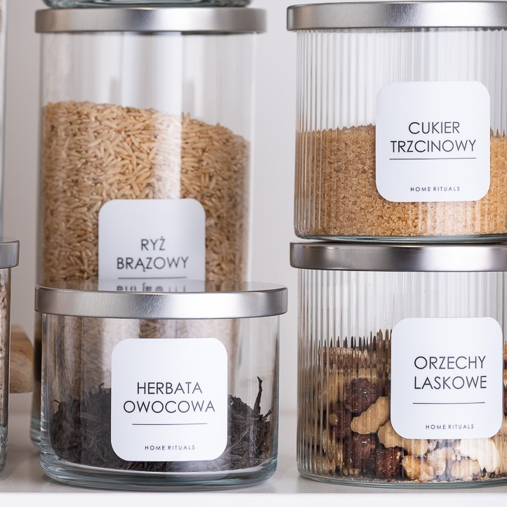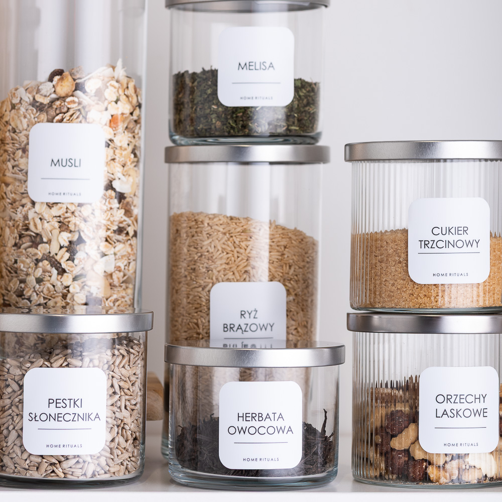 Aby ułatwić organizację, kolekcję PURE można uzupełnić o eleganckie naklejki, które pozwalają szybko odnaleźć odpowiednie składniki i i dobrze zorganizować domową spiżarnię.