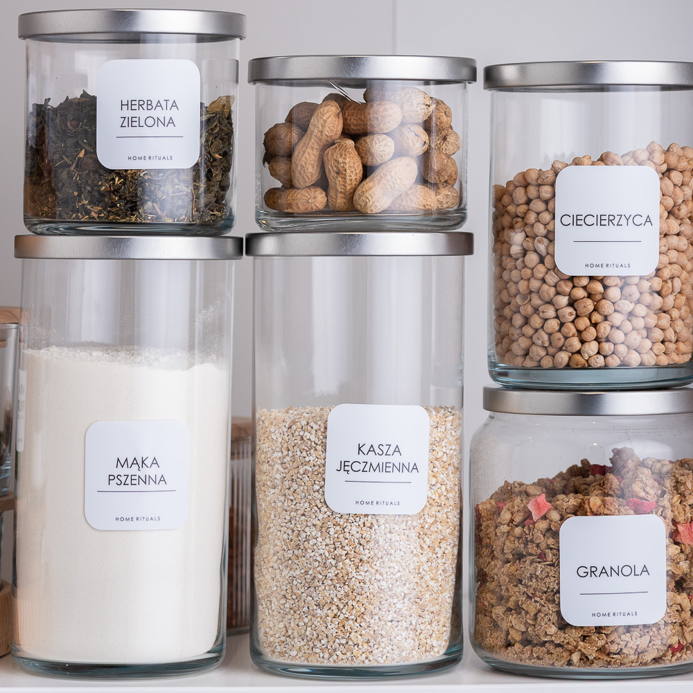 Aby ułatwić organizację, kolekcję PURE można uzupełnić o eleganckie naklejki, które pozwalają szybko odnaleźć odpowiednie składniki i i dobrze zorganizować domową spiżarnię.