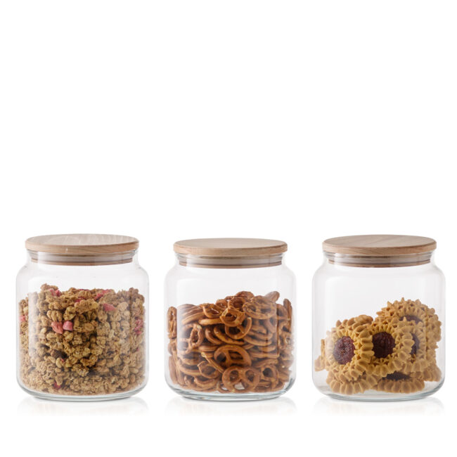 Praktyczny i elegancki zestaw szklanych pojemników do przechowywania z deklem drewnianym to doskonałe rozwiązanie do przechowywania różnorodnych produktów spożywczych. Jego uniwersalna, cylindryczna forma sprawia, że pasuje do każdej kuchni, a przezroczyste szkło pozwala na szybkie sprawdzenie zawartości.