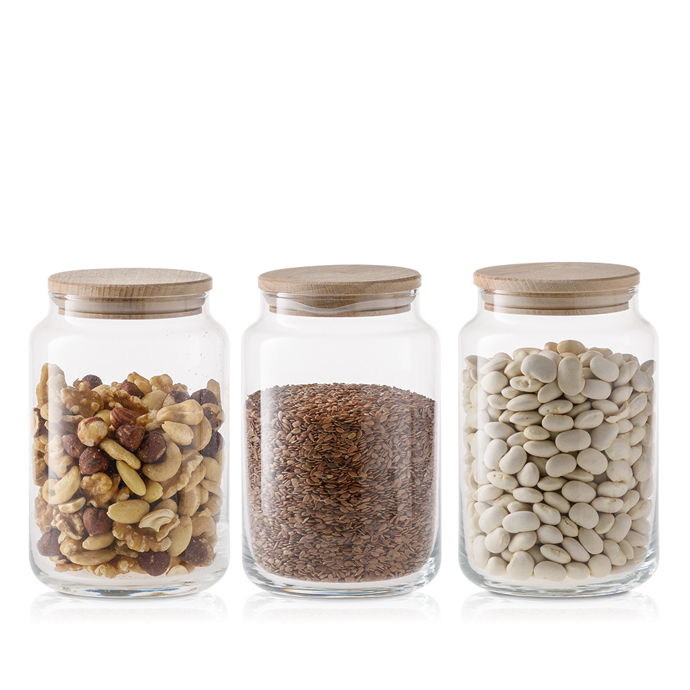 Praktyczny i elegancki zestaw szklanych pojemników do przechowywania z deklem drewnianym to doskonałe rozwiązanie do przechowywania różnorodnych produktów spożywczych. Jego uniwersalna, cylindryczna forma sprawia, że pasuje do każdej kuchni, a przezroczyste szkło pozwala na szybkie sprawdzenie zawartości.