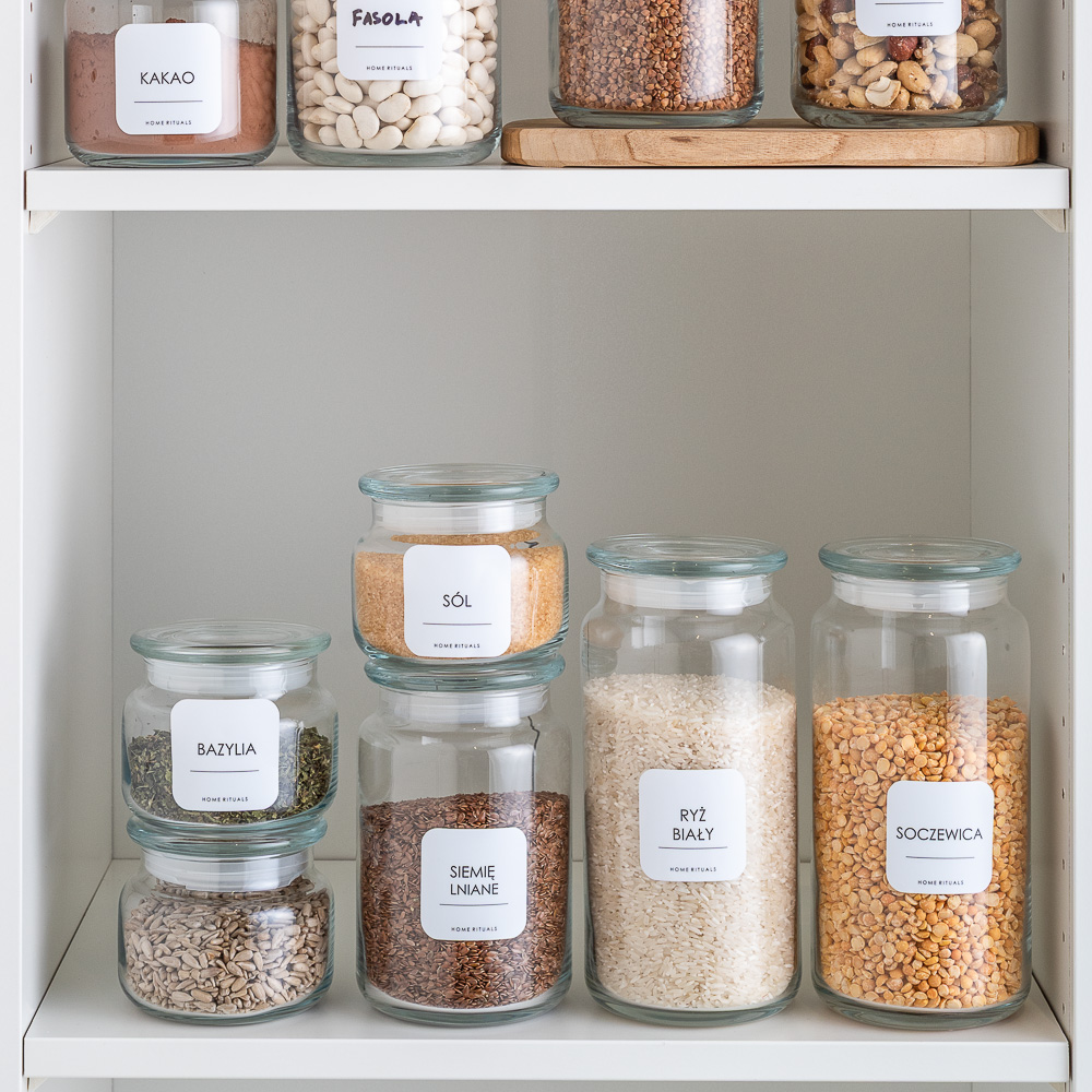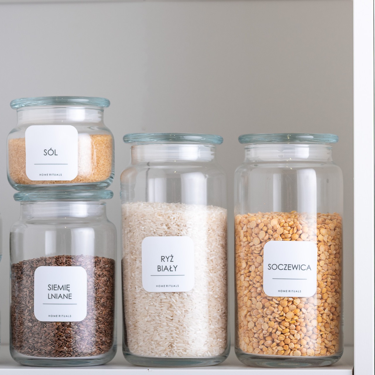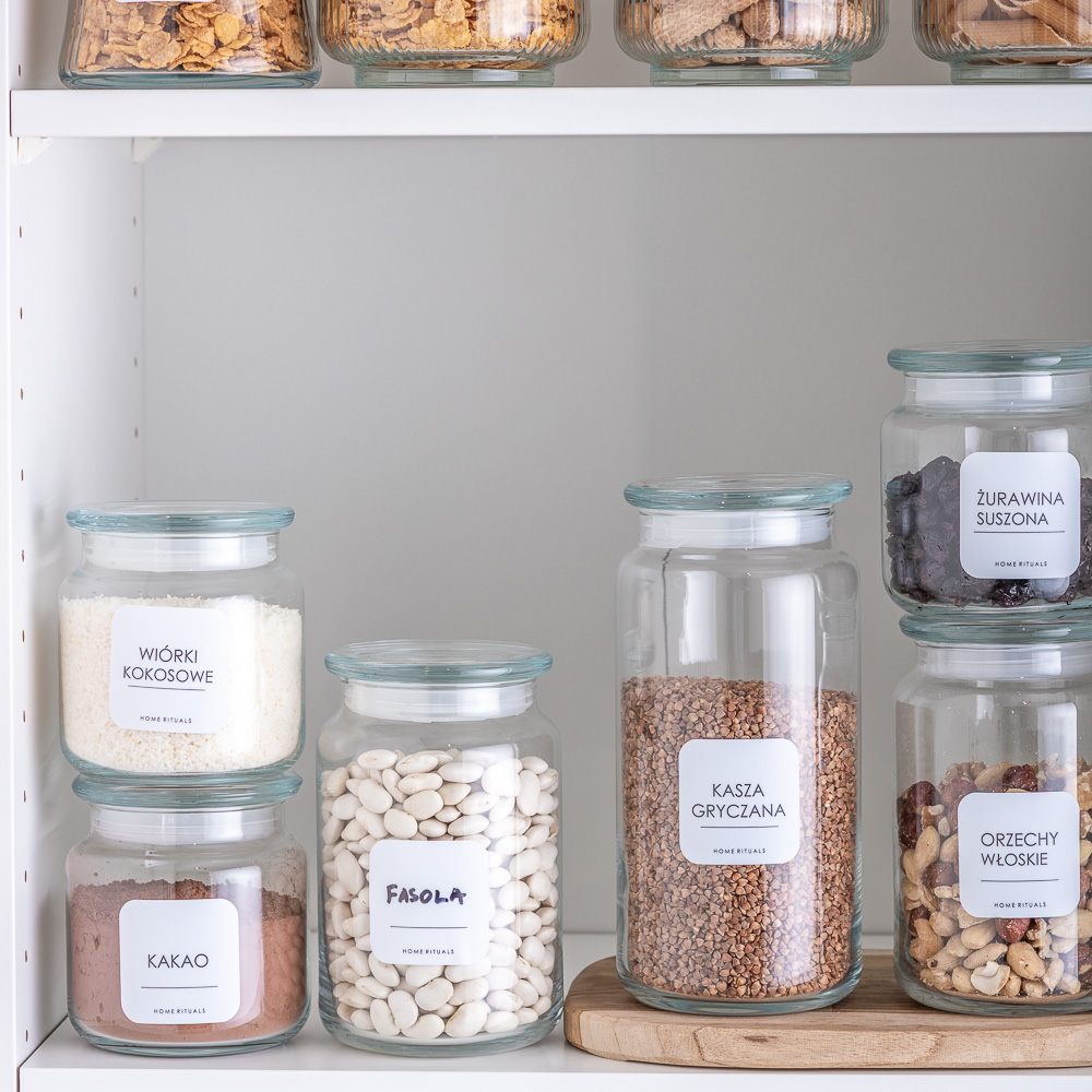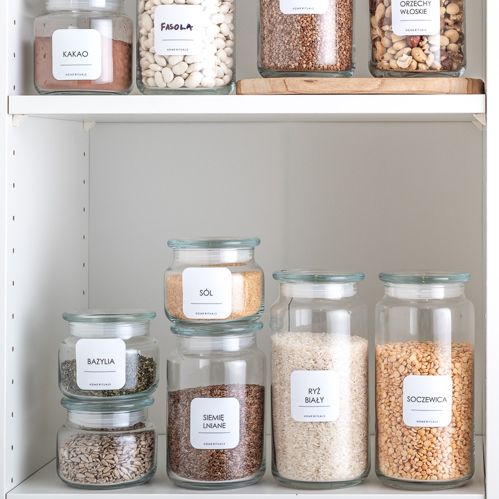 Aby ułatwić organizację, kolekcję PURE można uzupełnić o eleganckie naklejki, które pozwalają szybko odnaleźć odpowiednie składniki i i dobrze zorganizować domową spiżarnię.