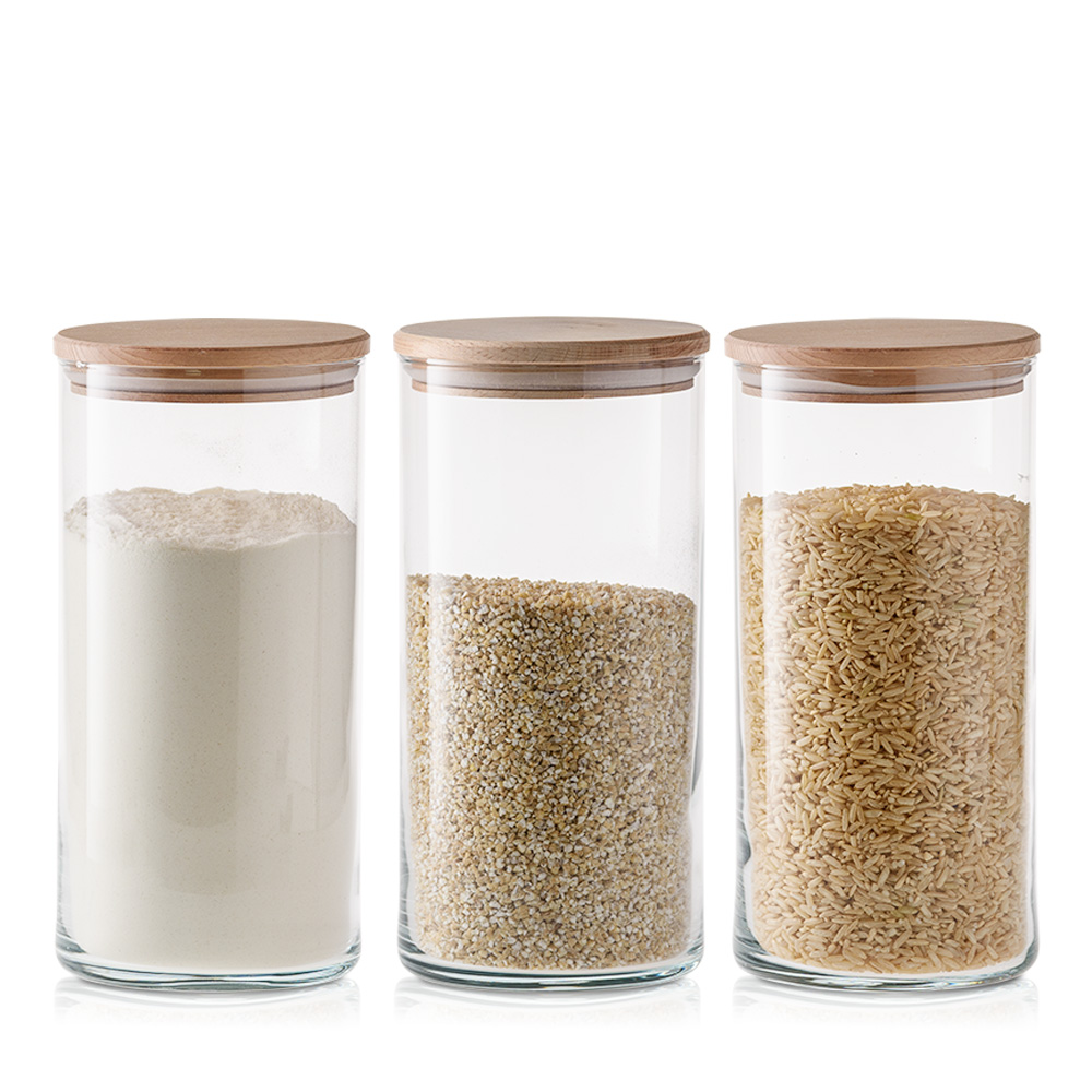 Praktyczny i elegancki zestaw wysokich, szklanych pojemników do przechowywania z deklem drewnianym to doskonałe rozwiązanie do przechowywania różnorodnych produktów spożywczych. Jego uniwersalna, cylindryczna forma sprawia, że pasuje do każdej kuchni, a przezroczyste szkło pozwala na szybkie sprawdzenie zawartości.