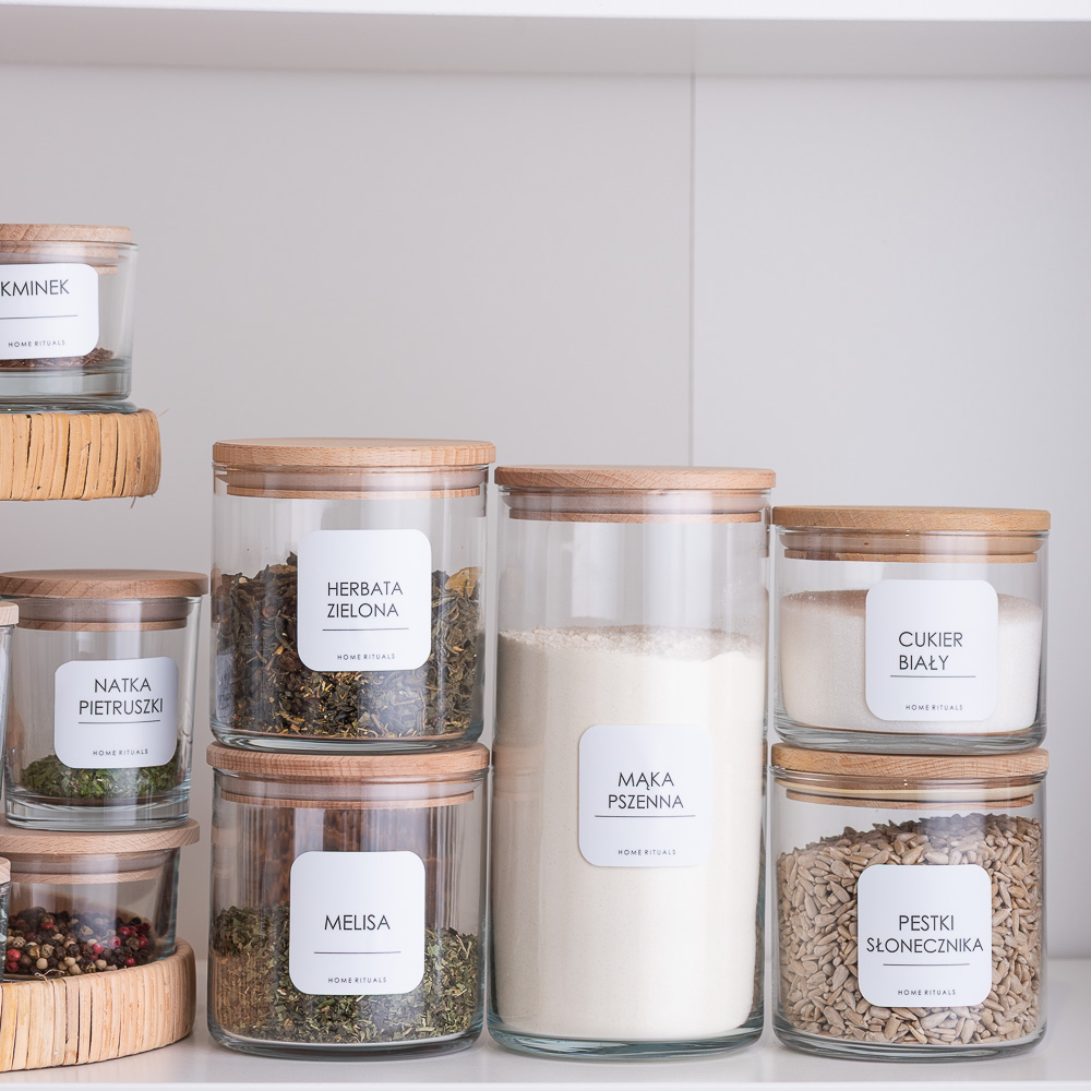 Aby ułatwić organizację, kolekcję PURE można uzupełnić o eleganckie naklejki, które pozwalają szybko odnaleźć odpowiednie składniki i i dobrze zorganizować domową spiżarnię.