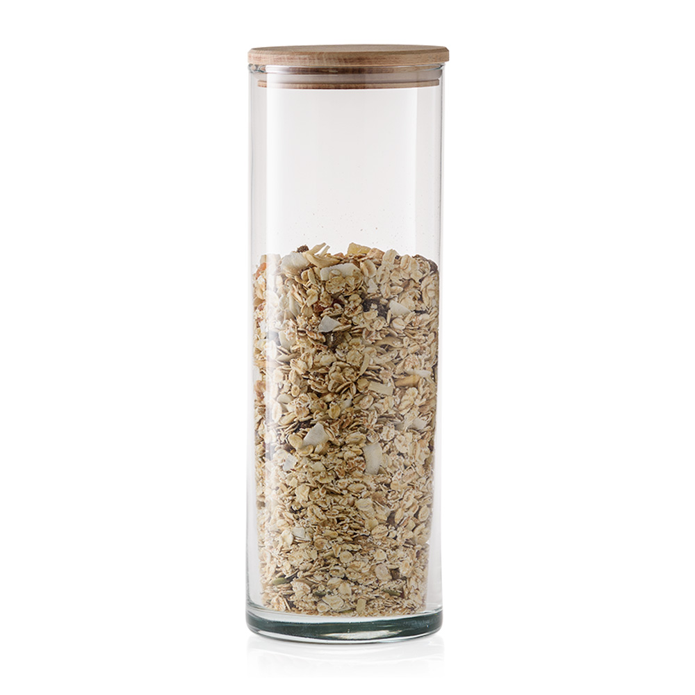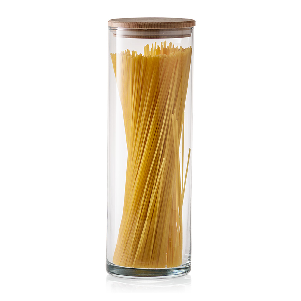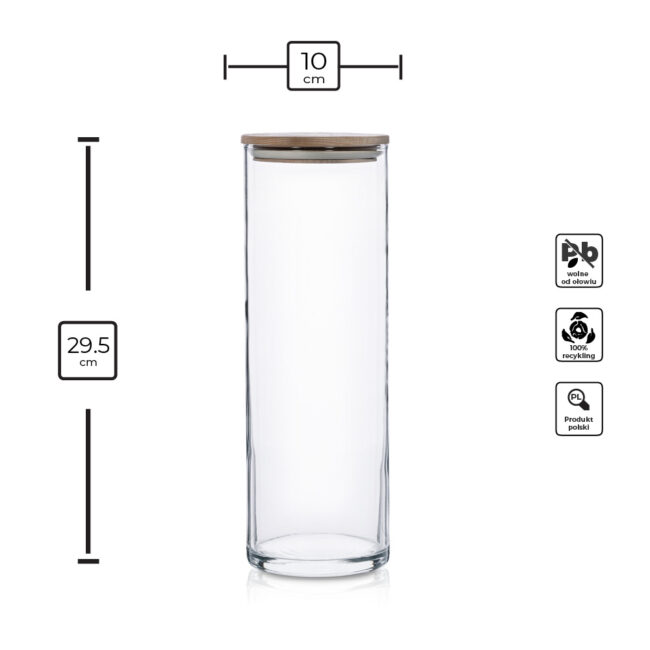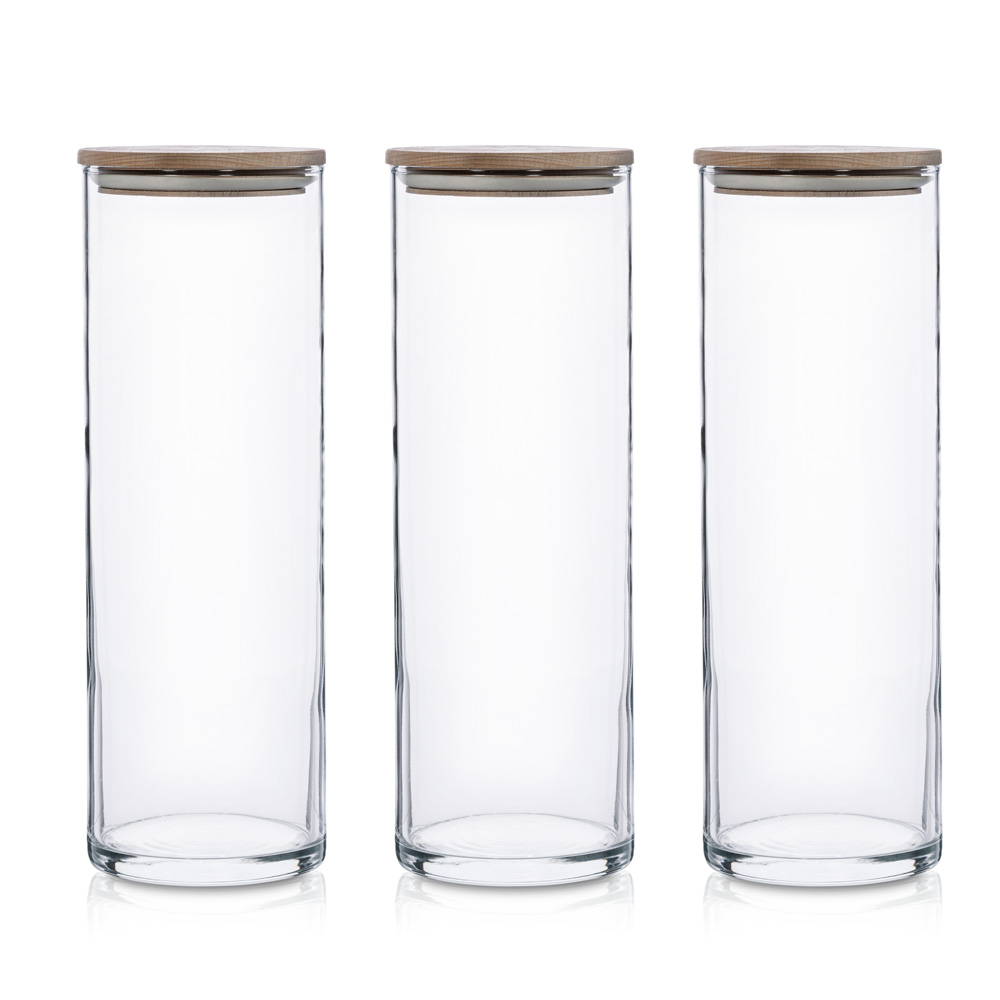 Praktyczny i elegancki zestaw szklanych, wysokich pojemników do przechowywania z deklem drewnianym to doskonałe rozwiązanie do przechowywania różnorodnych produktów spożywczych. Jego uniwersalna, cylindryczna forma sprawia, że pasuje do każdej kuchni, a przezroczyste szkło pozwala na szybkie sprawdzenie zawartości.