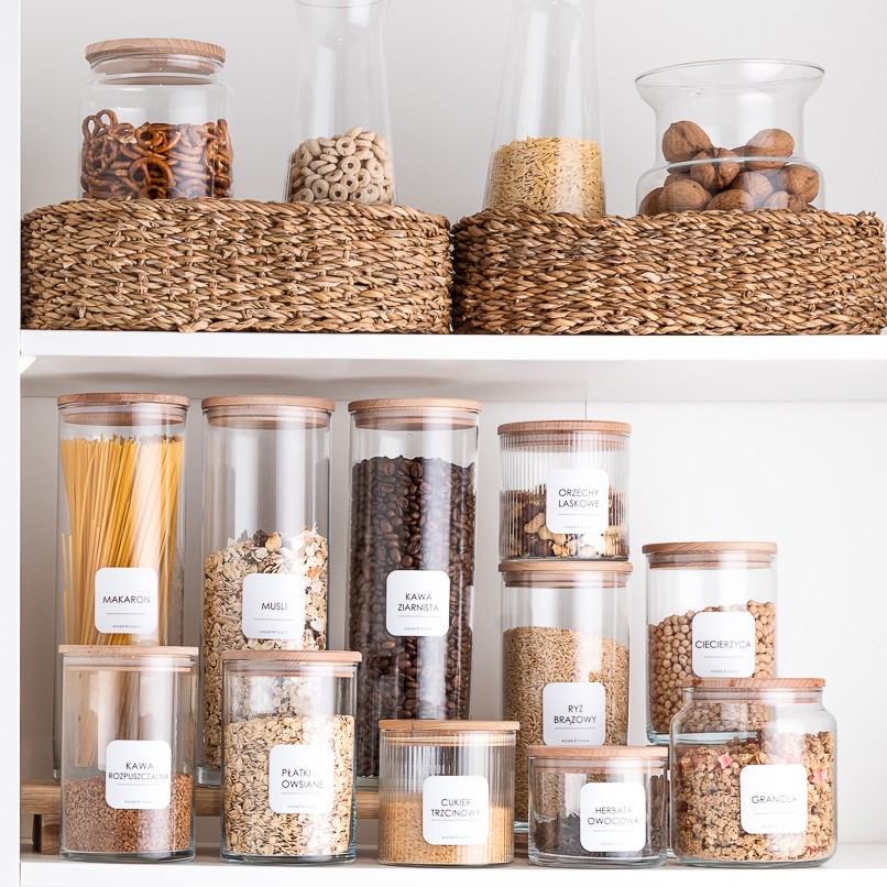 Aby ułatwić organizację, kolekcję PURE można uzupełnić o eleganckie naklejki, które pozwalają szybko odnaleźć odpowiednie składniki i i dobrze zorganizować domową spiżarnię.