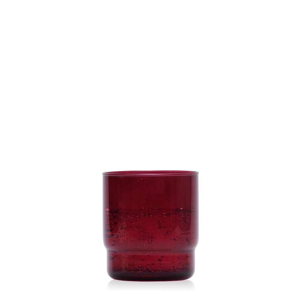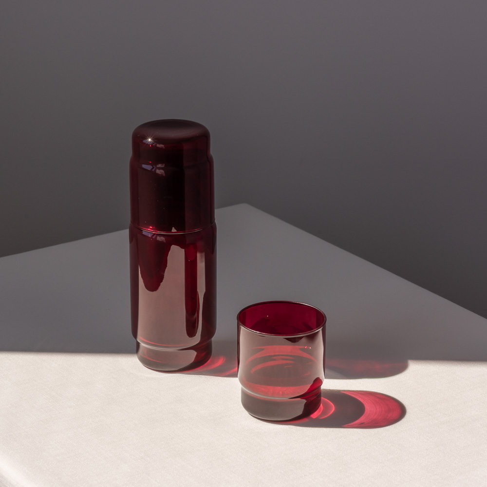 Szlachetny, transparentny kolor bordo podkreśla głębię szkła i pięknie współgra ze światłem, nadając aranżacji wyrafinowanego, nastrojowego charakteru.