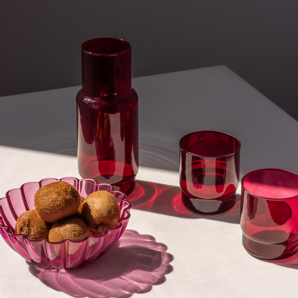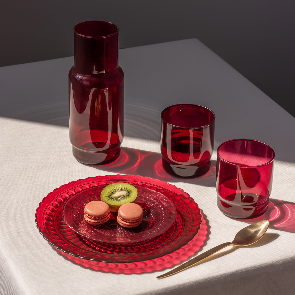 Zestaw CRISTAL COLOR w kolorze bordo to wyrafinowany akcent stołu, który buduje klimat. Transparentne szkło pięknie pracuje ze światłem, tworząc elegancki, wieczorny nastrój. Idealnie komponuje się z ciemnym drewnem, złotymi dodatkami i tekstyliami w ciepłych tonacjach.