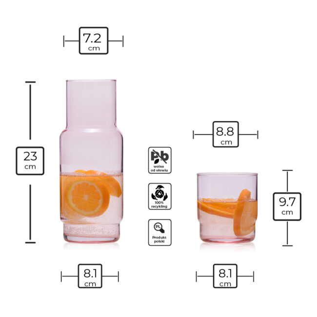 Komplet składa się z karafki oraz 6 niskich szklanek, tworząc harmonijną całość idealną zarówno do codziennego użytkowania, jak i na wyjątkowe okazje.