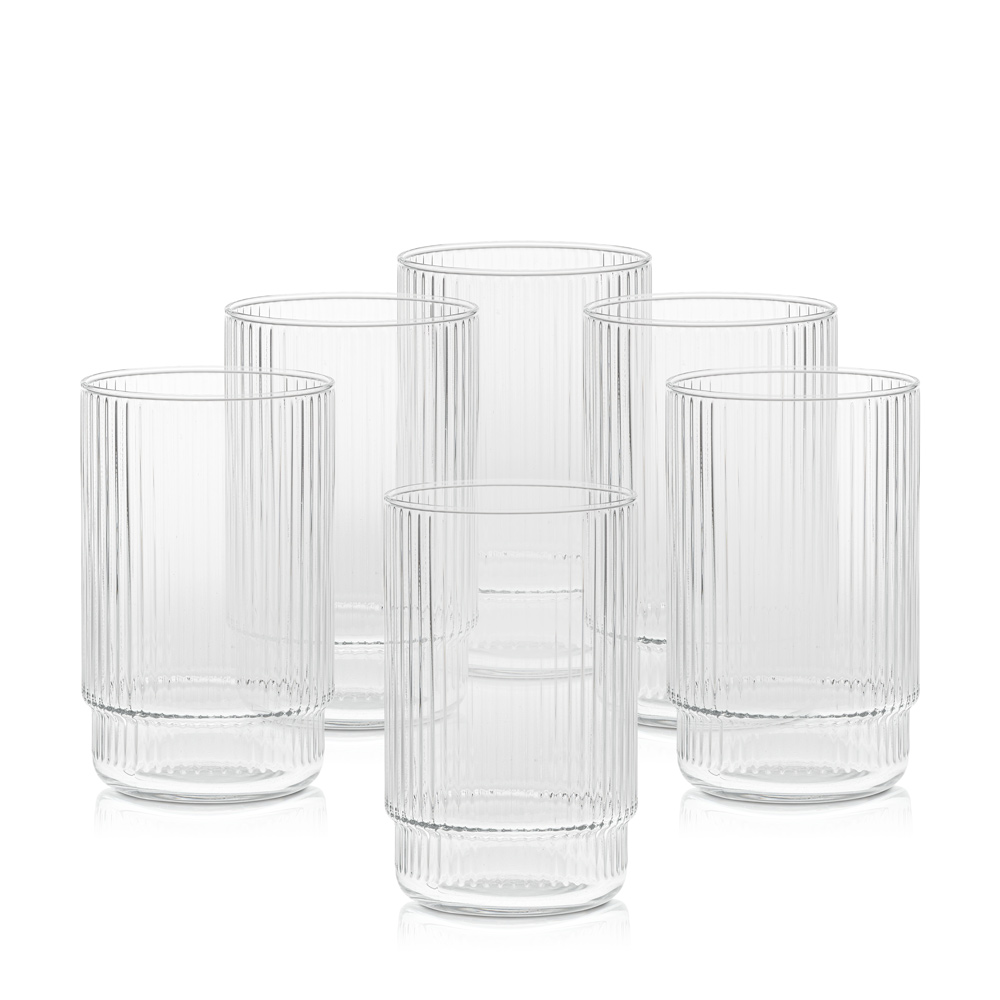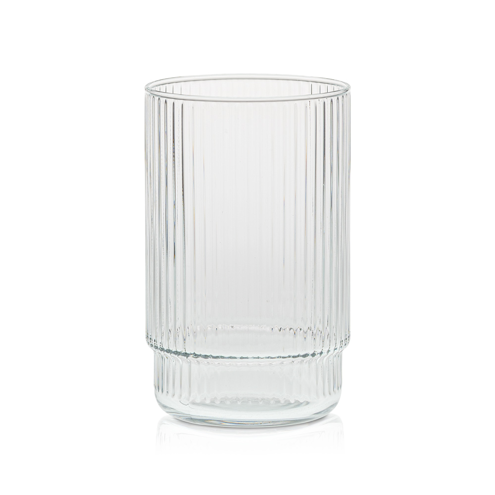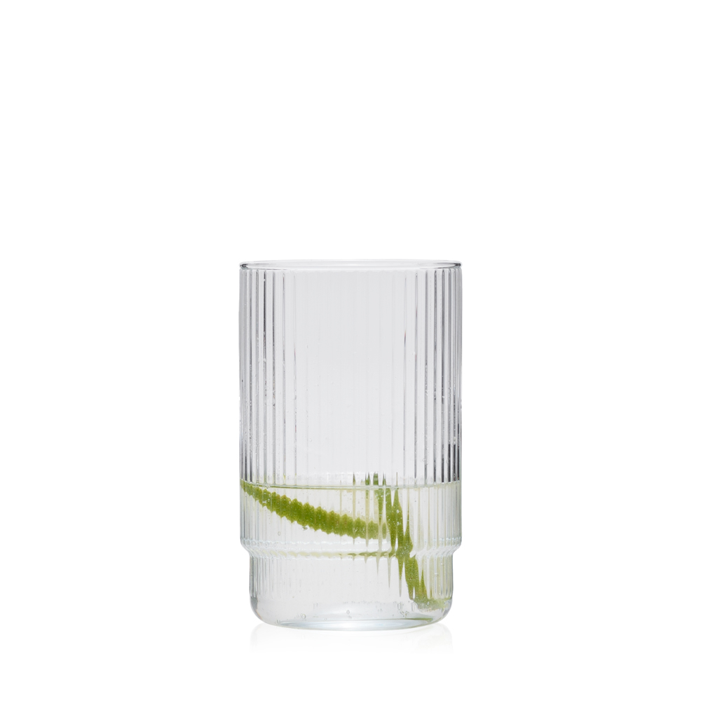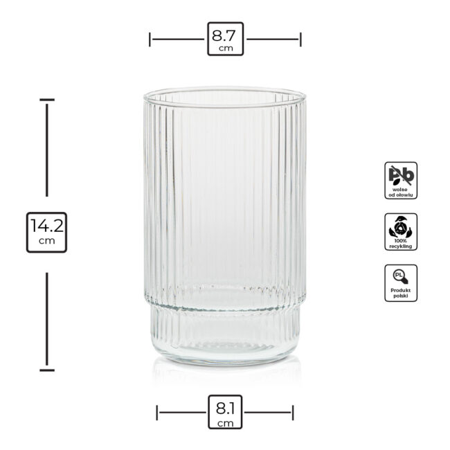 Smukła forma w połączeniu z ryflowaną powierzchnią sprawia, że szklanka prezentuje się lekko i stylowo, a jednocześnie pewnie leży w dłoni.