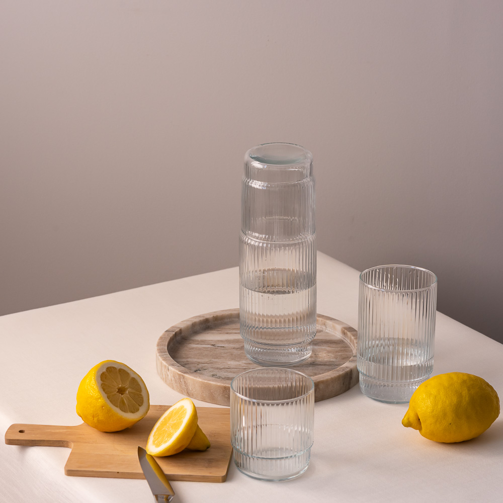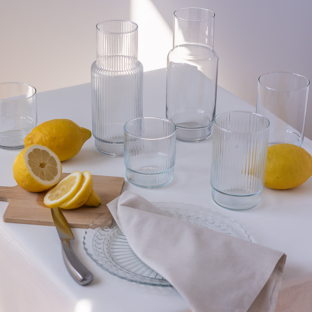 Ryflowana szklanka CRISTAL to doskonały przykład, jak detal może całkowicie odmienić charakter produktu. Subtelne żłobienia wprowadzają grę światła i cienia, dzięki czemu szklanka zyskuje głębię i wyjątkowy efekt wizualny na stole.