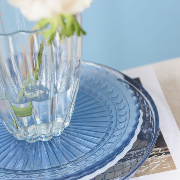 Przezroczystość w połączeniu z chłodnym błękitem pozwala na niezwykle efektowną grę światła – zastawa Glass Slipper Blue pięknie odbija promienie słoneczne w ciągu dnia i tworzy elegancki blask przy wieczornym oświetleniu.