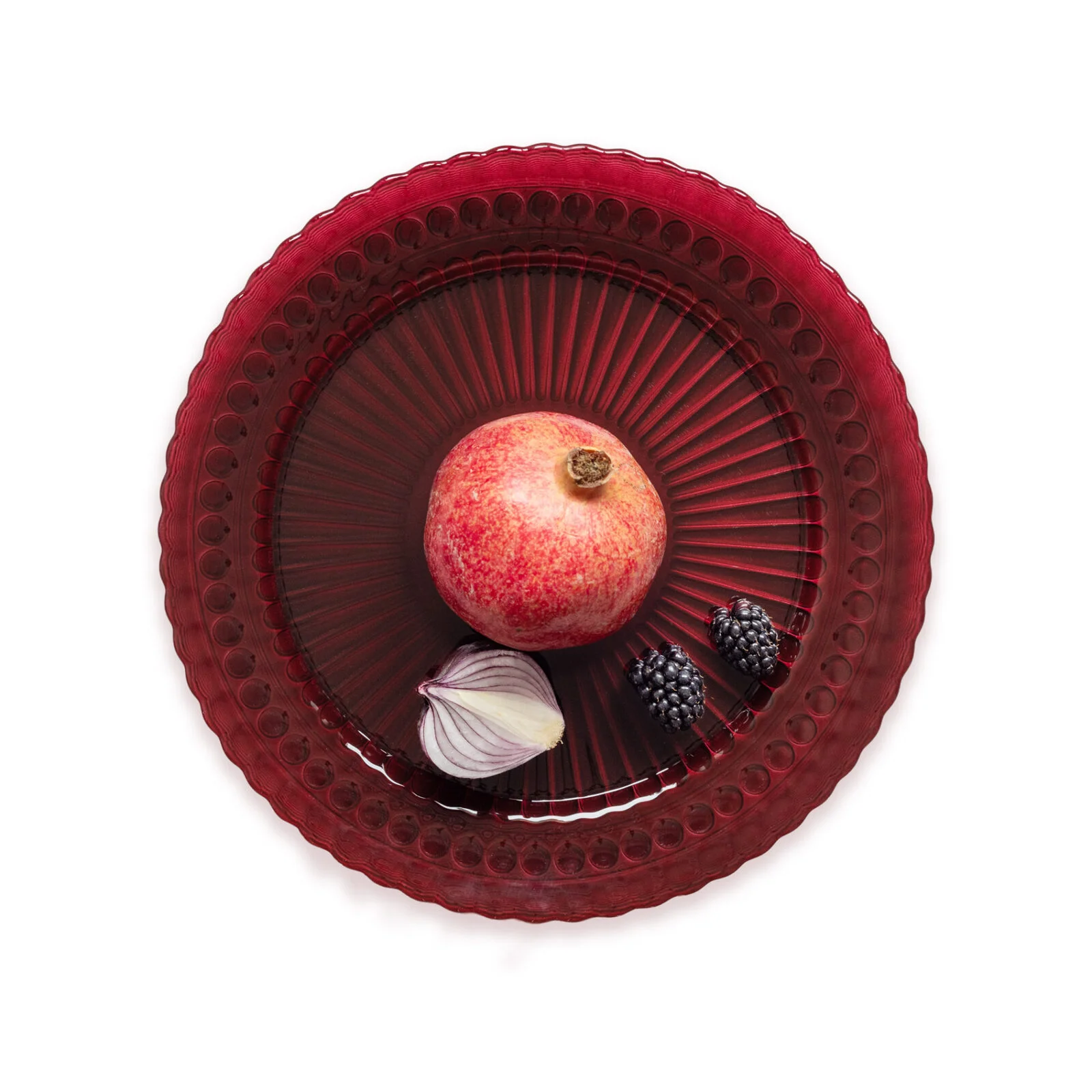 Podtalerz w transparentnym odcieniu to elegancki, szklany talerz o subtelnej, bordowej barwie, idealnie pasujący do każdego nakrycia stołu.