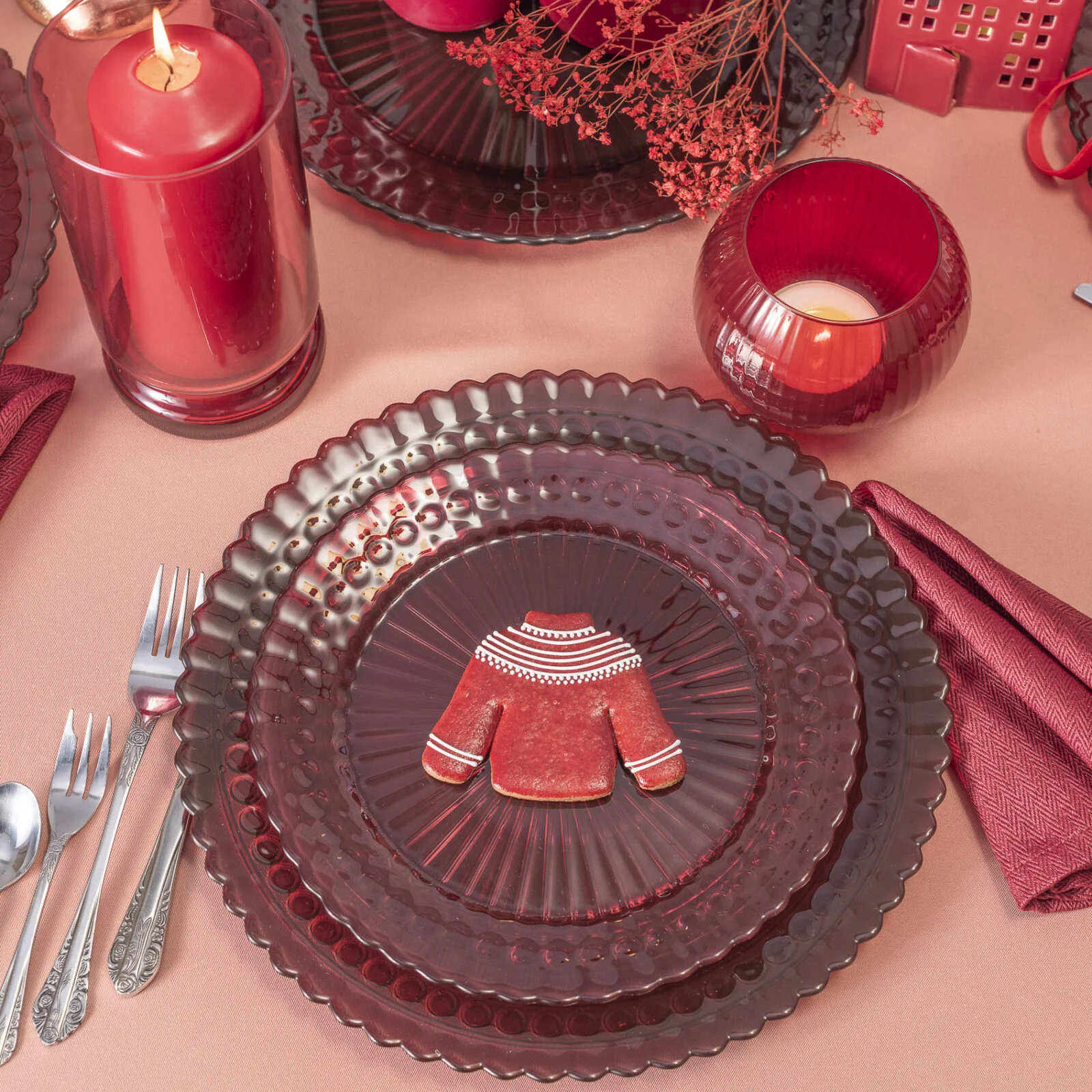 Podtalerz szklany w odcieniu bordowego transparentu to subtelne połączenie elegancji i nowoczesności, które wprowadza świeżość do każdej aranżacji stołu. Jego delikatnie rzeźbiony brzeg w formie falbanki nadaje mu lekkości i niebanalnego charakteru, czyniąc go prawdziwą ozdobą, która świetnie komponuje się z minimalistycznymi dodatkami, jak i bardziej wyrazistymi elementami dekoracyjnymi.